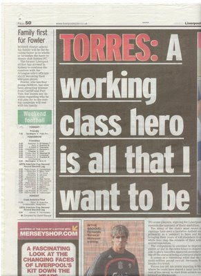 The Beatles’ın solisti ve aynı zamanda bir Liverpool taraftarı olan John Lennon’ın ilk solo albümünde “Working Class Hero/İşçi Sınıfı Kahramanı” adlı bir şarkı vardır. Şarkıda işçi sınıfı kahramanı olmanın sadece lafta kalmaması gerektiğinden ve boş bir iş olmadığından bahsedilir. Liverpool’a transfer olan Torres bu şarkıya atfen “tek istediğim şey işçi sınıfı kahramanı olmak” demiş ve yalan rüzgârına dâhil olmuştur.